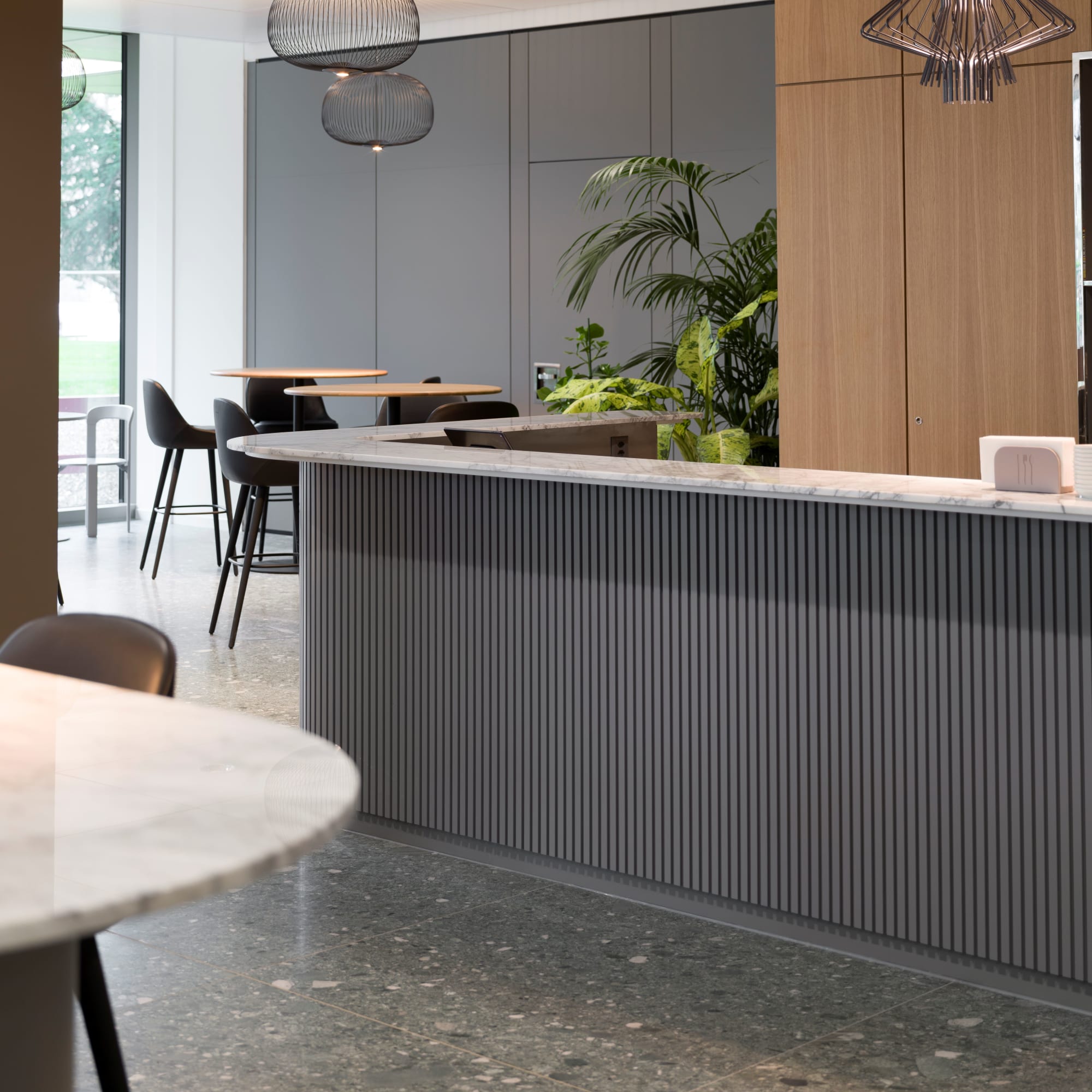Das ewz-Betriebsgebäude in Oerlikon präsentiert sich nach der ersten von zwei Erneuerungsetappen nachhaltiger und freundlicher. Belebtes Herzstück der modernisierten Stockwerke ist das neu gestaltete Atrium mit Eingangsbereich, Empfang und Cafeteria. Die identitätsstiftende Umgebung für über 520 Mitarbeitende des Elektrizitätswerks der Stadt Zürich wird geprägt vom ausdrucksstarken Innenausbau von GLAESER. Die hochwertigen Schreinerarbeiten wie die geschwungene Empfangstheke, diverse Sitz und Pflanzenkombinationen sowie Barelemente, Sitznischen und Telefonzellen überzeugen mit individuellen Formen, ausgeklügelten Funktionen und nachhaltigen Materialien.